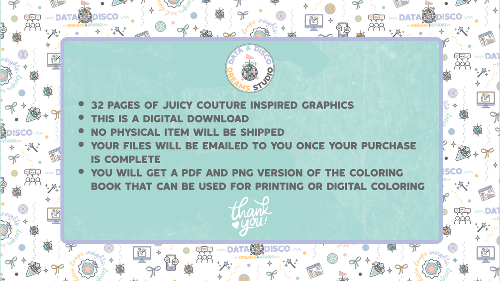 By purchasing, you agree to these policies and understand you’re supporting a small, woman-owned creative studio. Thank you for trusting us to bring a little more data, disco, and design magic into your world! ✨